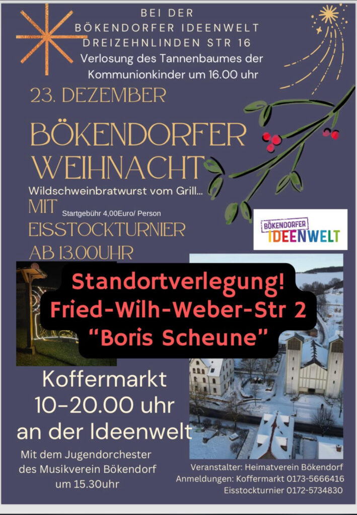 Die Bökendorfer Weihnacht findet dieses Jahr am Sa. 23.12.23 ab 10 Uhr an der Ideenwelt statt.
